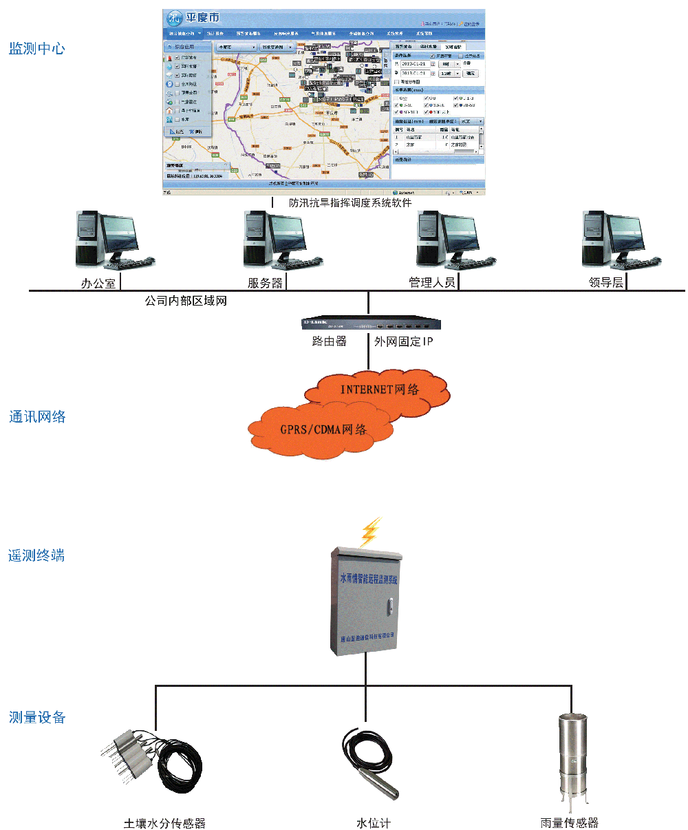 一、系統(tǒng)簡介 國家防汛抗旱指揮系統(tǒng)工程是關(guān)系到我國國民經(jīng)濟(jì)可持續(xù)發(fā)展和人民生命財產(chǎn)安全的一項戰(zhàn)略性水利基礎(chǔ)設(shè)施建設(shè),是國家水利信息化的主體工程。該工程的實施,對于提高我國防汛抗旱指揮調(diào)度決策現(xiàn)代化水平,減輕洪澇災(zāi)害,保障人民群眾的生命財產(chǎn)安全,具有十分重要的意義和顯著的減災(zāi)效益。 二、系統(tǒng)組成 v 監(jiān)控中心:中心服務(wù)器、外網(wǎng)固定IP、防汛抗旱指揮系統(tǒng)軟件; v 通信網(wǎng)絡(luò): 基于移動無線GPRS或電信無線CDMA網(wǎng)絡(luò); v 采集終端:水文水資源遙測終端RTU; v 計量儀表:雨量計、水位計、閘位計、土壤水分傳感器; v 供電方式:電池供電、太陽能供電、市電。