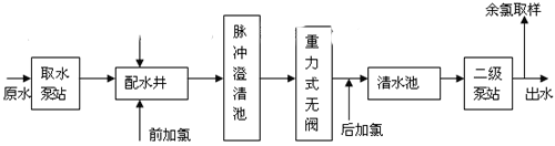 圖2 加氯工作流程圖 如圖2示:前加氯系統(tǒng)與后加氯系統(tǒng)共用一個氯氣氣源,共設(shè)兩組供氯氯瓶,兩組氯瓶互為備用.,根據(jù)氣瓶壓力自動切換。如當(dāng)正在使用的一組氯瓶出口管上的壓力小于某個值時,壓力式自動切換器將自動切換到另一組氯瓶,保證連續(xù)供氯。在加氯自動控制系統(tǒng)中,將PLC的模擬量輸出信號送給加氯機(jī)的模擬量輸入端,通過控制加氯機(jī)中執(zhí)行器的動作,控制水射器中的真空度,進(jìn)而控制了加氯量的大小。加氯自動控制系統(tǒng)中還包括氯氣氣源的自動切換,漏氣自動報警和漏氯吸收裝置的自動控制。在加氯自動控制系統(tǒng)中,關(guān)鍵是對加氯機(jī)的控制。 自動控制氯系統(tǒng)可進(jìn)一步配備計算機(jī)數(shù)據(jù)采集系統(tǒng),以便實現(xiàn)加氯間無人值班目標(biāo)。把出廠水中的余氯分析儀測定的數(shù)據(jù)送到加氯間,中心化驗室和調(diào)度室,以便值班人員可隨時監(jiān)測出廠水余氯值和調(diào)整余氯設(shè)定值。 3影響加氯自動控制的主要原因(1)采樣時間 采樣時間的長短,直接影響加氯的效果。為了達(dá)到自動控制的目的,要求氯氣經(jīng)充分混合后馬上檢查余氯值作為復(fù)合環(huán)控制的反饋信號。但現(xiàn)場中,有的工藝設(shè)計將混合接觸時間定的太長,對控制系統(tǒng)來說,即意味著純滯后時間的延長,造成測定結(jié)果不準(zhǔn)確。因此,在后加氯的投加點(diǎn)和采樣點(diǎn)的選擇上,工藝設(shè)計時應(yīng)充分考慮自動控制的要求。通常情況下,后加氯在清水池進(jìn)水管上,在氯氣與水充分混合后應(yīng)在盡可能短的時間內(nèi)取樣,水經(jīng)過加氯點(diǎn)到余氯分析儀處的水流時間一般不要超過5分鐘,在水與氯氣充分混合的前提下取樣時間越短越好。可用如下二種方法論縮短取樣時間:一是縮短取樣管的長度;二是加快取樣管中的水流速度如加大取樣水管排水分流管。(2)檢測設(shè)備 余氯分析儀的檢測值的正確性也是控制加氯的關(guān)鍵。由于余氯分析儀存在零點(diǎn)漂移,應(yīng)定期進(jìn)行校正。同時在軟件編制時,對信號數(shù)據(jù)的處理也可考慮濾波、穩(wěn)定等形式進(jìn)行適當(dāng)處理以增加數(shù)據(jù)的可靠性。(3)信號傳輸 主要是各底層設(shè)備的檢測信號要及時準(zhǔn)確的傳輸?shù)絇LC中,然后進(jìn)行處理。現(xiàn)場中大都設(shè)備采用標(biāo)準(zhǔn)電流信號(0―20mA或4―20mA)。4 自動加氯系統(tǒng)的應(yīng)用 南方某一水廠,以江水為水源,水廠原設(shè)計規(guī)模為6萬m3/d。工藝流程如下示: